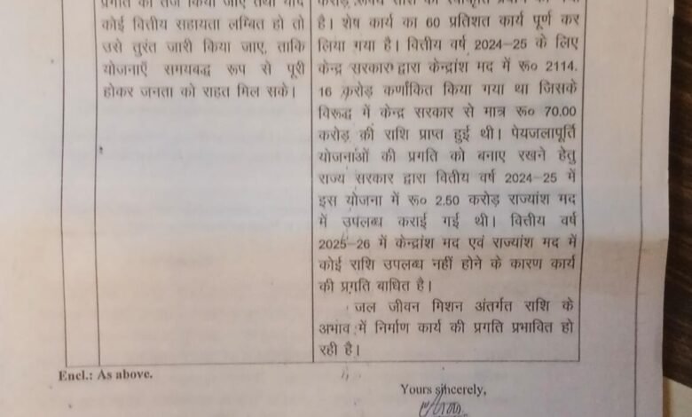 पत्र में यह भी लिखा गया है, जल जीवन मिशन की अवधि 2028 तक विस्तारित की गई है। साथ ही इस मिशन के अन्तर्गत गुणवत्ता युक्त एवं पाइपलाईन के द्वारा जन भागीदारी के माध्यम से नागरीकों को पेयजल की उपलब्धता को सुनिश्चित करने का प्रयास किया जा रहा है।