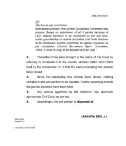 साकची एवं केंद्रीय कमेटी ने इसी तथ्य को हाईकोर्ट में रखा इसी के मद्देनजर हाई कोर्ट ने आदेश दिया कि दोनों पक्ष के अनुसार चुनाव हो चुके हैं और ऐसे में जो पीड़ित व्यक्ति है कानून के अनुसार सिविल न्यायालय की शरण ले सकता है।