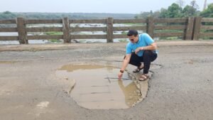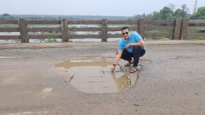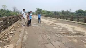 जर्जर लुआबासा पुल पर भड़के भाजपाई, सांकेतिक प्रदर्शन कर विभाग को चेताया, पुलिया पर उभरे बड़े गड्ढे, सरिया में फंसकर गिर रहे वाहन चालक