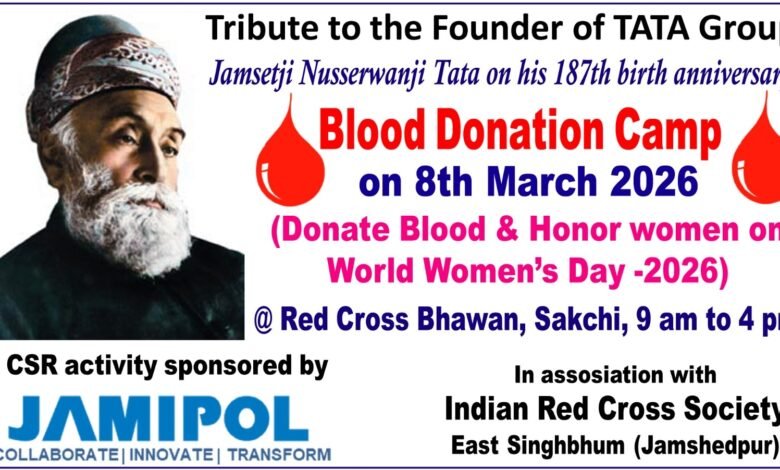 जमशेदपुर-  भारतीय रेड क्रॉस सोसाईटी, पूर्वी सिंहभूम द्वारा टाटा स्टील समुह की कम्पनी जेमीपोल लि. के सहयोग से टाटा समुह के संस्थापक महान जमशेतजी टाटा को श्रद्धांजली अर्पित करते हुए 8 मार्च अंतर्राष्ट्रीय महिला दिवस को रक्तदान शिविर का आयोजित प्रत्येक वर्ष की भांति रेड क्रॉस भवन में किया जायेगा। रक्तदान शिविर के वे सभी रक्तदाता रक्तदान कर सकेंगे, जिनके पिछले रक्तदान का 90 दिन पूरा हो गया हो। रेड क्रॉस सोसाईटी, पूर्वी सिंहभूम के मानद सचिव विजय कुमार सिंह ने 8 मार्च को आयोजित हो रहे रक्तदान शिविर के लिए रक्तदाताओं का आह्वान करते हुए कहा कि महिला शक्ति के सम्मान में और जमशेदपुर में भगवान की तरह पूजित जमशेतजी टाटा को श्रद्धांजलि अर्पित कर इस रक्तदान शिविर में युवक युवतियां रक्तदान को आगे आयें। रक्तदान करने वाले सभी को स्मृति चिन्ह प्रदान कर सम्मानित किया जायेगा। महिलाओं को विशेष स्मृति चिन्ह इस अवसर पर प्रदान किया जायेगा।