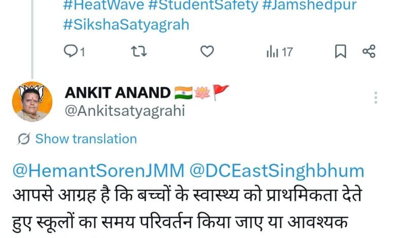 अंकित आनंद ने सोशल मीडिया प्लेटफॉर्म एक्स (पूर्व में ट्विटर) पर पोस्ट करते हुए मुख्यमंत्री हेमंत सोरेन और पूर्वी सिंहभूम के उपायुक्त कर्ण सत्यार्थी को टैग कर त्वरित हस्तक्षेप की मांग की है। उन्होंने कहा कि जब अदालतों का समय भी मॉर्निंग कर दिया गया है, तो स्कूली बच्चों को भी इस भीषण गर्मी से अविलंब राहत मिलनी चाहिए
