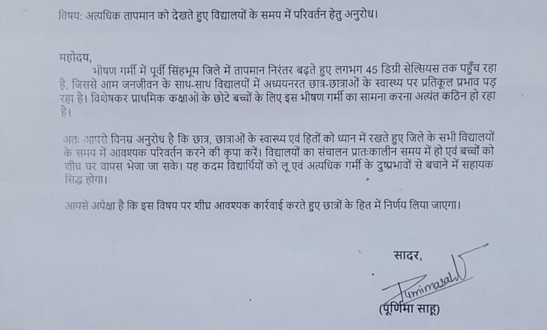 भीषण गर्मी में बच्चों के स्वास्थ्य की चिंता: विधायक पूर्णिमा साहू ने स्कूलों का समय बदलने का किया अनुरोध, उपायुक्त को लिखा पत्र