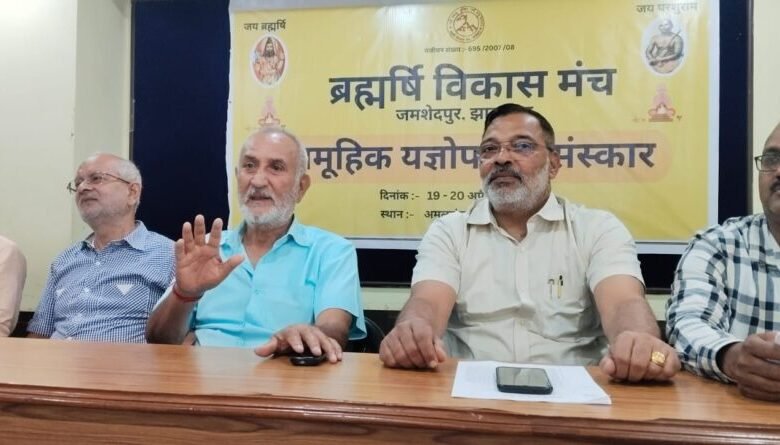 ब्रह्मर्षि विकास मंच (रामनारायण शर्मा गुट ) जमशेदपुर द्वारा गुरुवार को तुलसी भवन में एक संवाददाता सम्मेलन आयोजित कर आगामी 19-20 अप्रैल 2026 को होने वाले सामूहिक यज्ञोपवीत संस्कार की जानकारी दी। मंच के केंद्रीय अध्यक्ष राम नारायण शर्मा, संरक्षक राम प्रकाश पाण्डेय, कार्यकारी अध्यक्ष सुधीर कुमार सिंह, महासचिव मुकेश कुमार और कार्यक्रम के प्रभारी प्रभाकर शर्मा ने संयुक्त रूप से संवाददाताओं को संबोधित किया