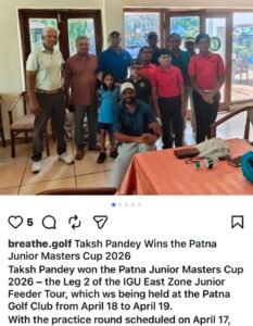जमशेदपुर- लौहनगरी के तक्ष पांडेय ने पटना जूनियर मास्टर्स गोल कप 2026 अपने नाम किया है। जो आईजीयू ईस्ट जोन जूनियर फीडर टूर का दूसरा चरण था और 18 से 19 अप्रैल तक पटना गोल्फ क्लब में आयोजित किया गया।