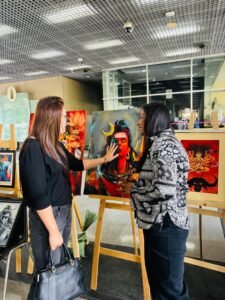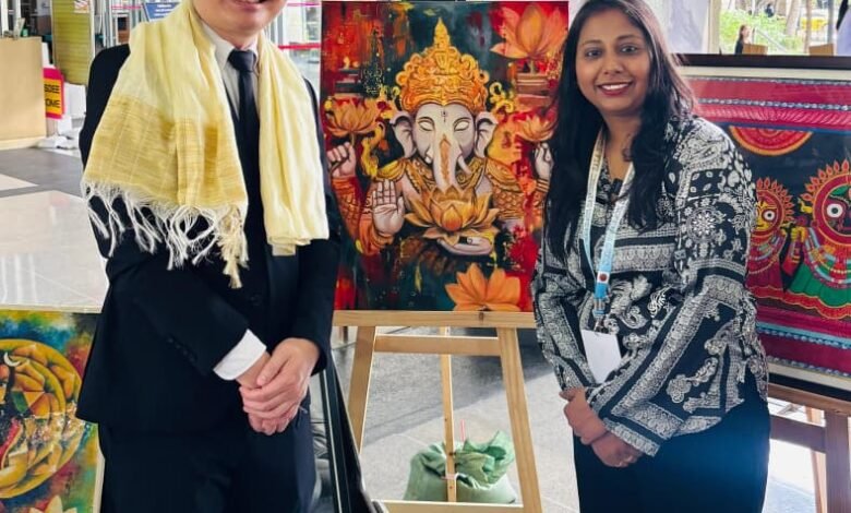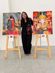 सुमन प्रसाद ने इस मंच पर अपनी दो विशेष कृतियाँ प्रस्तुत कीं। पहली कृति “अनंता ऐश्वर्या” (24×30 इंच, एक्रिलिक) में भगवान गणेश के माध्यम से अनंत समृद्धि, ज्ञान और दिव्यता का सजीव चित्रण किया गया। वहीं दूसरी कृति “समाधि” भगवान शिव पर आधारित रही, जिसमें ध्यान, आंतरिक शांति और ब्रह्मांड से जुड़ाव को दर्शाया गया। उनकी इन दोनों कृतियों को अंतरराष्ट्रीय दर्शकों ने काफी सराहा।