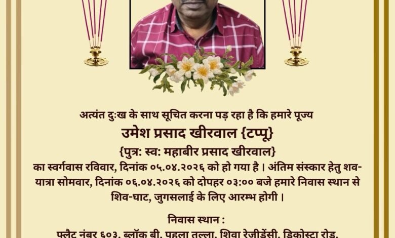सामाजिक कार्यकर्ता एवं परम पूज्य शंकराचार्य के प्रिय भक्त एवं अजीज दोस्त उमेश प्रसाद खीरवाल टप्पू के निधन पर अधिवक्ता सुधीर कुमार पप्पू ने गहरा शोक जताया है